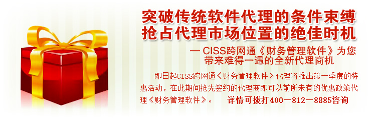为回馈广大代理商长期以来的合作支持,也为了让更多有代理意愿的人加入CISS跨网通软件代理的大家庭,即日起CISS跨网通财务管理软件代理将推出季度的特惠活动,在此期间抢先签约的代理商即可以的低价代理财务管理软件,机会难得,过期不候。如此难得一遇的代理商机您还要错过吗?拨打代理咨询热线400—812—8885,跻身代理市场从CISS跨网通财务管理软件开始。