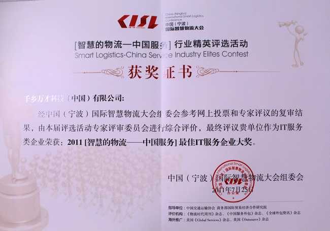 “智慧的物流——中国服务”IT服务企业奖是由中国国际智慧物流大会组委会参考网上投票和专家评议的复审结果,由本届评选活动专家评审委员会进行综合评价,为表彰为物流提供IT信息化支持的企业所颁布的奖项,获奖的企业除千乡万才科技(中国)有限公司外,还包括摩托罗拉、用友等。