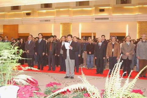 纪念会于上午8:30准时开始,与会全体人员首先以默哀一分钟向温世仁先生表达了深切的怀念之情。温世义董事长以二弟的身份向大哥发表了纪念感言,感念和大哥在一起风雨兼程的日子,汇报了这一年来国内外形势以及泛明日团队的工作业绩与成就。随后发言的是甘肃省台办主任赵少智先生,并代表国台办王毅主任致纪念词;武威市市委常委、统战部部长万国仁先生也发表了纪念致辞;新加坡环球商业系统集团,成亚企管顾问有限公司,温创办人的学生林恒毅总裁和黄羊川国际会议中心员工代表赵小平分别发言,表达了对温创办人的缅怀。