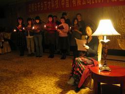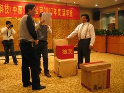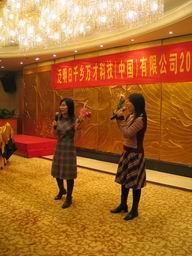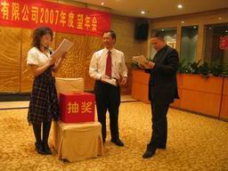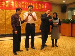 温董和林总在宴会上先后致词,并表达了对员工的关怀之情。接着林总为06年度的CE和非CE销售颁奖。宴会在一片欢声笑语中拉开了帷幕。在宴会上,来自公司各个岗位的同仁纷纷秀出自己的绝活。将自己最拿手的节目贡献出来,与大家分享。首先出场的是北京办事处的合唱《相亲相爱一家人》,接着在林太太的带领下北京办事处同仁又演唱了歌曲《爱的真谛》。SO部门表演的舞台剧《星火》向大家形象的诠释了千乡万才关怀西部的创举,之后客户工程部的同事表演的舞蹈《四小天鹅》使现场的温度达到了沸点。为一月份过生日的同仁举办生日会是一年一度望年会的保留节目,今年也不例外,寿星们在同事的祝福中又长大了一岁。宴会的,公司为了奖励大家一年辛苦认真的工作,还准备了丰厚的奖品,的气氛把整个晚会推向了高潮,来自各个办事处的员工在领到奖品后,07年的望年会在大家的欢声笑语和对来年的期盼中圆满结束。