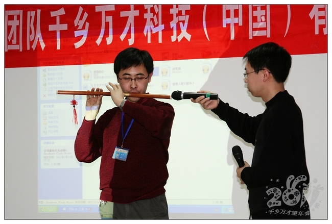 在陈副总的精彩致辞后,晚会节目正式开始。高晋、赵桐两位带来的改编相声《我是音乐家》,两个人珠联璧合的表演,风趣幽默的台风,诙谐幽默的表演赢得在场观众阵阵掌声。而接下来的节目和环节更是高潮迭起。李鹏程、刘霞带来的《美丽的神话》更是让大家看到了千乡万才同事们多才多艺的一面。将晚会现场气氛推向顶点的节目当属RD和CE部门同事们联袂表演的小品《我要当老板》,平时工作中就以幽默见长的庞承悦这一回果然没有让大家失望,将一个好吃懒做的乞丐形象表演的活灵活现。一轮接一轮的环节让台下传来阵阵掌声欢呼。晚会历时2小时,在一曲悠扬的巴乌独奏《我的心里从此永远有个你》圆满落下帷幕。