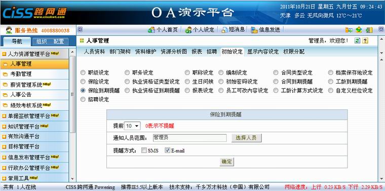 1、“保险到期提醒”指设定的几日后这在职和停薪留职员工某些保险记录到达保险结束时间的提醒,0表示不提醒;