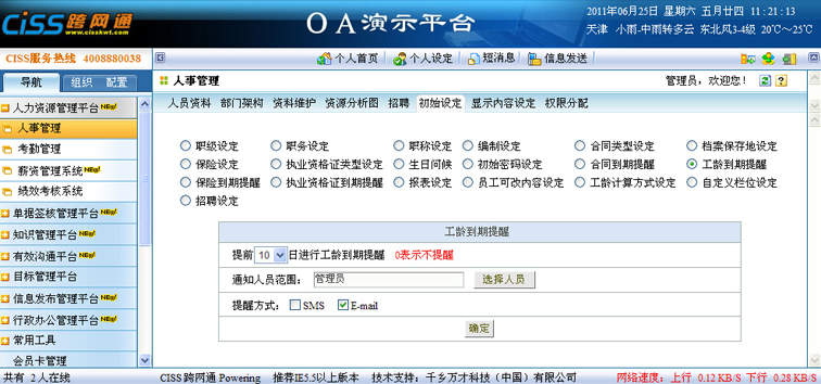 举例说明:针对上图中设定的工龄到期提醒,表示距离每位员工在本单位工作满整数年日期的前10天,以E-mail的形式通知管理员。