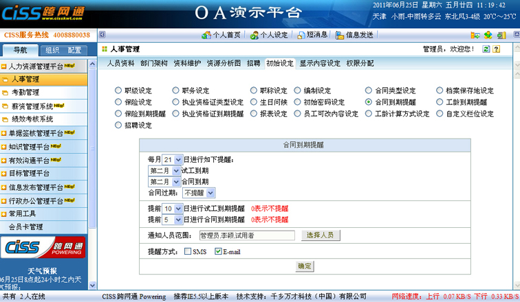 1、每月的固定日期进行合同到期提醒,提醒合同包括试工合同、和正式合同;提醒到期月份范围为当月、第二月、第三月;