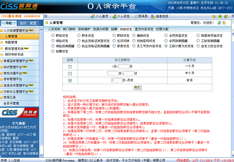 6、 如果只启用第二行,则第二行起始到职日必须填写1,结束到职日必须填写31;
