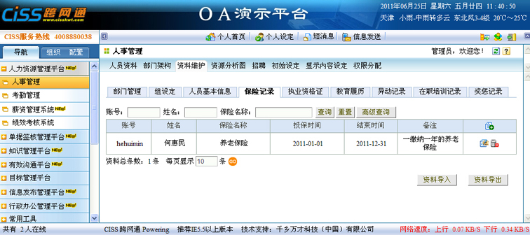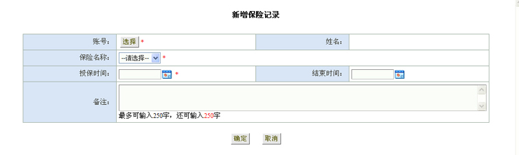 1、 新增人员保险信息:在【保险记录】下点击新增按钮进入保险信息录入页面,选择员工和保险名称,确定保险开始和结束时间,点击。重复这样的操作,直到添加完全部的人员信息;