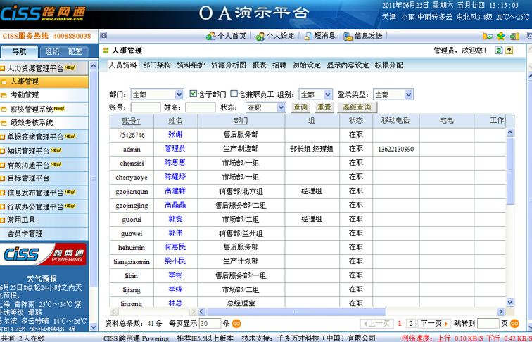 2、 如果模块管理员在权限分配中设定了主管可浏览下属信息时,部门主管可以在【人员资料】中看到自己下属的信息,信息内容遵循自己的浏览权限。