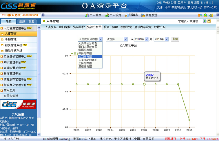 1、 拥有浏览企业资源分析图权限的员工可以在此看到企业人员的各种分图,分析图的内容来源来自模块管理员在【资料维护】=>“人事基本信息”中录入的企业员工信息,包括人员成长、部门人员、学历、年龄、性别、工龄、人员流动和星座分布图;