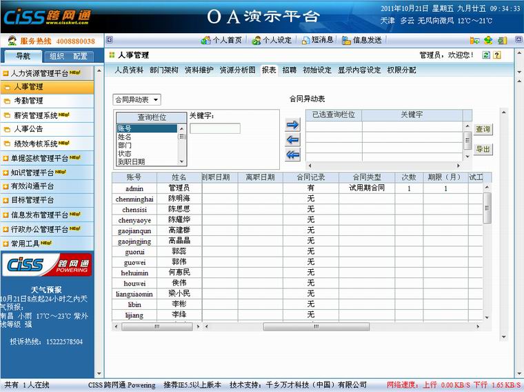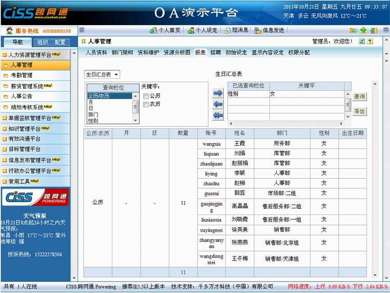 1、 员工在此看到自己拥有浏览权限的报表,报表显示栏位为模块管理员在初始设定中设定的显示栏位;