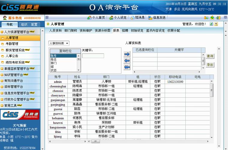 用途:根据报表的设定情况显示所有员工的基本信息。