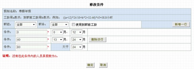 4、 条件定义:用来设置不同的工龄、职级、职务员工的请假时数: