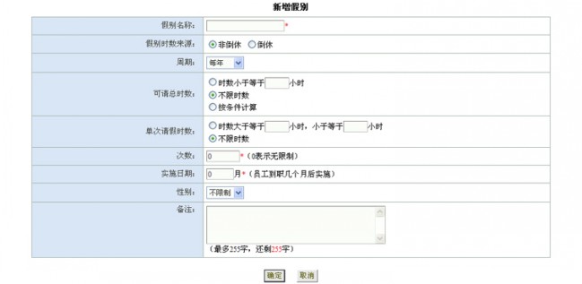 7、 次数:定义每种假别可请次数(0表示无限制);