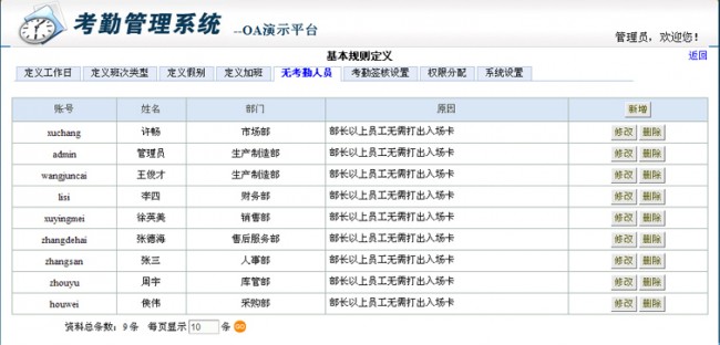 2、 对于已经设定好的无考勤人员,系统支持修改、删除操作。