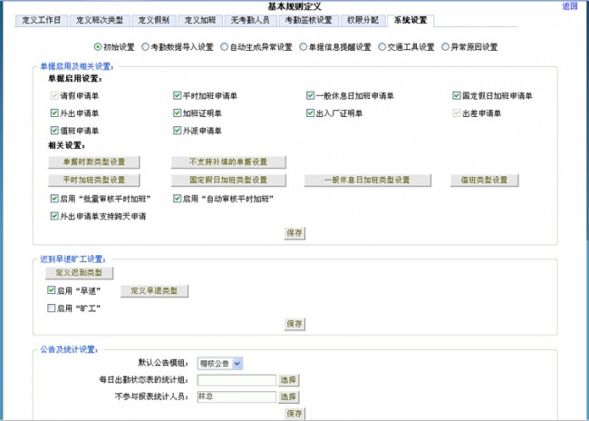 1、 单据时数类型设置:单据时数的整点半点的设定及单据的取舍规则,时数类型包括:整点、半点;进位方式包括:只舍不入、只入不舍、四舍五入三种方式,如请假申请单选择只入不舍,员工请假2小时10分钟系统会认为该员工请了3小时的假;