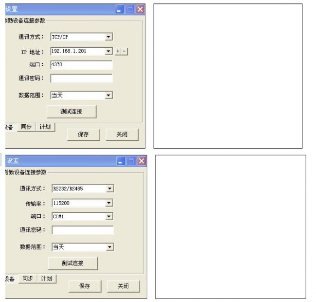 2、 RS232/RS485方式(图二):适用于考勤机不自带网口,需要与一台固定PC机连接使用的情况。传输率依情况而定(115200),端口选择考勤机与PC机连接的串口号。