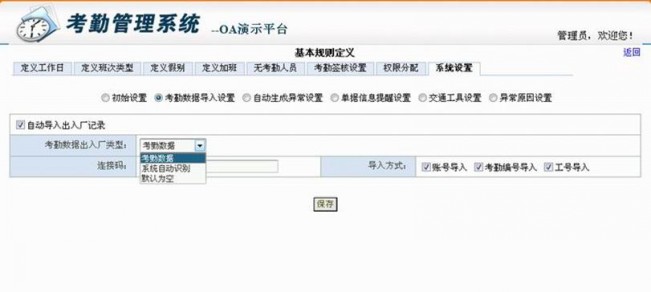 1、 考勤数据出入厂类型:下拉菜单下选择考勤数据,即考勤系统的出入厂记录以与平台挂接的考勤机为准,考勤机上的出入厂时间就是系统中的出入厂时间;选择系统自动识别选项,则需要在平台上设定系统的出入厂时间段,系统只会提取考勤机上的打卡时间,而出入厂类型以系统规定的时间段为准;如果选择默认为空即系统只记录打卡时间,不会显示出入厂类型;