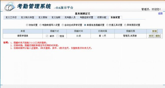 相关设置:设定单据签核中所有的单据在生效日期前几天以何种方式通知相关人员,如请假申请单,在单据生 效前2天以邮件的形式通知人事专员。