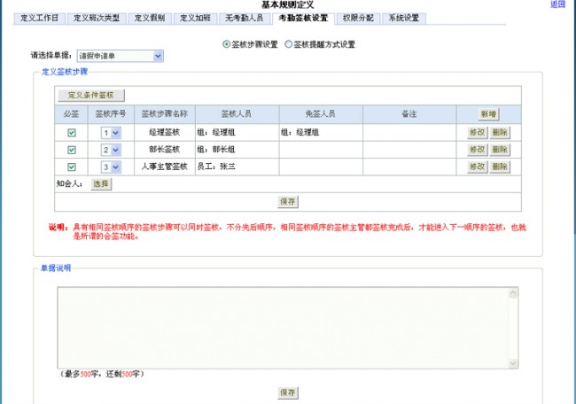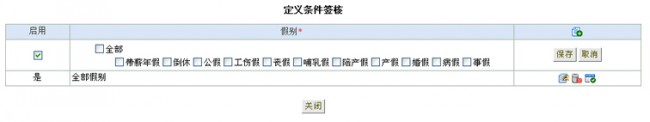 说明:条件签核中的签核流程定义方法与考勤签核设置中的操作方法相同。