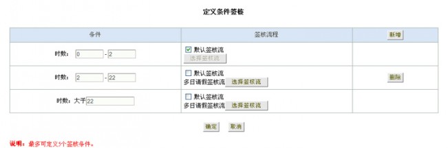 1、 :新增签核流程,并且可设定时数条件,最多可定义5个签核条件;