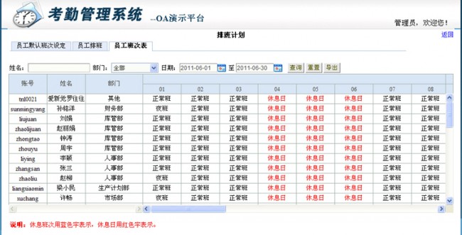 用途:在此标签下可查看一定条件下所有员工某个月的班次情况,支持查询和导出功能。