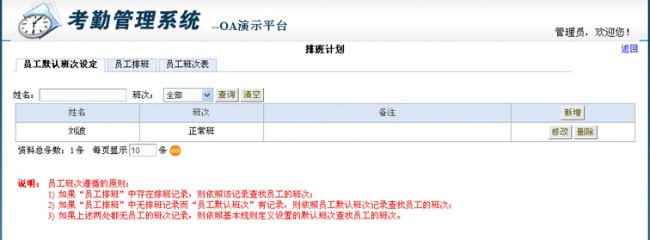 2、 如果“员工排班”中无排班记录而“员工默认班次”有记录,则员工班次遵循员工默认班次;