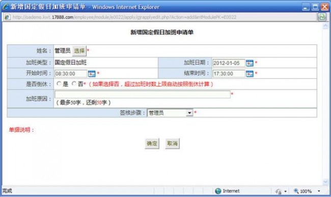 4、 在新增/修改国定假日加班申请单时,可申请的加班时数受【基本规则定义】à定义加班à“一般休息日加班、国定假日加班”所设定的时数限制。