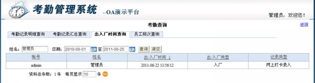 用途:员工在出入厂时间查询中可以查看自己每天出入厂时间。
