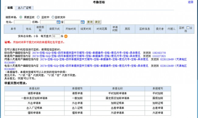 5、 可以使用手机短信方式进行考勤签核,按照“跨网回复规则”中描述的短信格式进行签核。(并且支持WAP签核)。