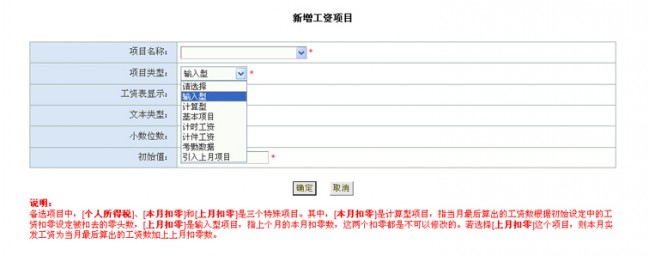 2) 在项目名称的下拉菜单中个人所得税和本月扣零、上月扣零为已设定栏位,其中个人所得税可以根据国家规定进行手动修改,本月扣零和上月扣零栏位类型分布为计算型和输入型并且不能修改,当系统启用了扣零设置时,在设定帐套规则时需要手动的添加本月扣零和上月扣零。