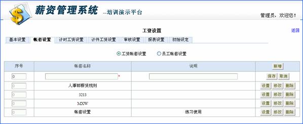 1) 建立新的薪资发放规则,点击新增按钮,填写帐套名称及相关说明:
