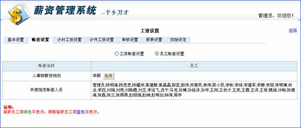 ¨ 【工资设置】=>帐套设置=>员工帐套设置:初始设定,针对设定好的薪资规则分配适用人员;