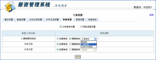 用途:设定薪资系统中各种帐套和计时/计件工资的审核规则,包括新建工资表是否需要审核,应用哪种审核流程(流程可自定义)。