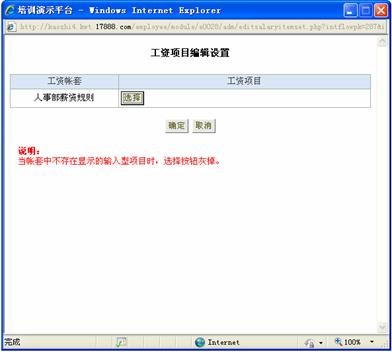 点击工资项目设置页中的“确定”按钮,将保存此页的工资项目设置,点击“取消”按钮,则放弃本页操作,关闭本页;