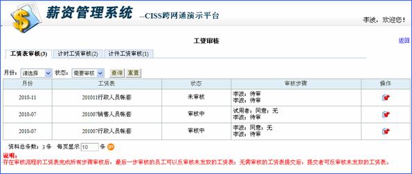 用途:对于在工资管理、计时/计件工资管理中新建的需要审核的工资表进行审核操作。