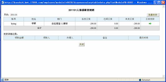 当员工的薪资被发放到自己手中时,财务人员可以针对该员工执行工资发放操作,点击该页面的发放图标即可。当该帐套下的所有薪资已经发放完成时,可以在系统中进行批量发放操作,点击批量发放按钮即完成全体全功的薪资发放操作。发放详细记录中可以记录薪资的领取人和办理人。