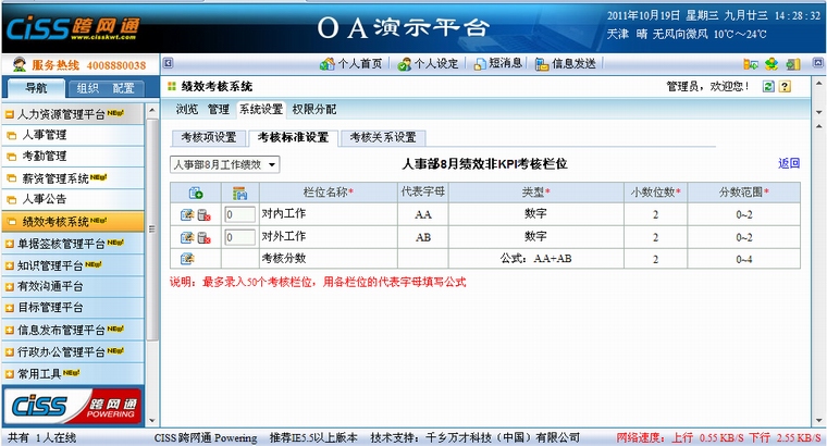 3、 “公式”:编辑考核标准的公式规则,可将各个考核项做加减乘除统计运算;