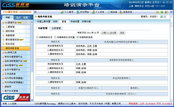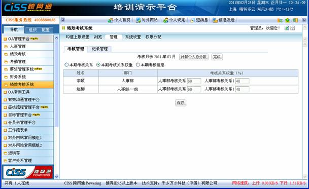 当一个员工同时出现在多个考核关系考核时,在“本期考核关系权重”中设置每个考核关系的权重,默认每个考核关系的权重为100%并且可以修改,但必须保证每个被考核人的考核权重之和为100%。系统在计算个人绩效得分时,会依据此处的权重设定进行相应的计算。