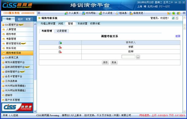 该页可用来新增删除当前考期考核关系内的被考核人,分数发布之前可进行该页操作,完成该页操作后,考核关系会根据操作后的状态发生变化(考核关系中有KPI考核项,若考核关系状态为“考核表发布”,新增人员后考核关系会变为“已开通”,若考核关系状态为“已开通”,删除人员后,如果此时剩余所有人的考核表都发布了,考核关系会变为“考核表发布”)。