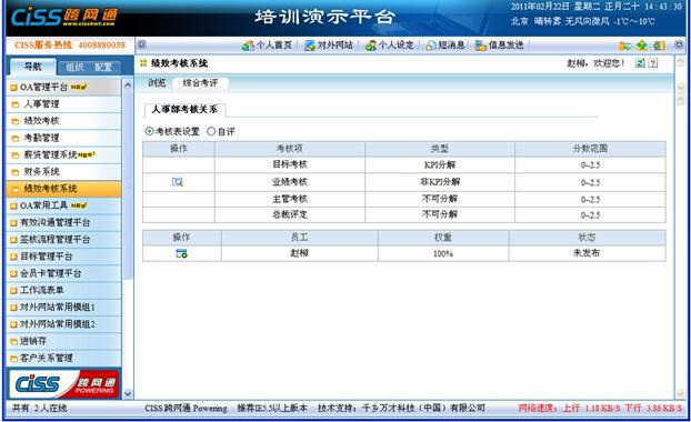 1、 根据登录员工参与的考核关系(责任人、被考核人)不同,以不同的tag分别显示,每个tag显示该关系所有考核项的信息及相关人的考核表(登录者是责任人的考核关系中显示所有人的考核表,登录者是被考核人的考核关系中只显示自己的考核表),若该考核关系中存在KPI分解考核项,责任人可以设置所有被考核人的KPI分解考核项的考核栏位,被考核人只可以设置自己KPI分解考核项的考核栏位;