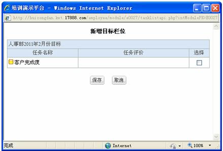 选择完成后页面自动新增一行,将目标任务名称带入本考核栏位的栏位名称中(栏位名称不可编辑),设置后其它信息后点击“保存”即可保存成功,完成新增后再新增考核目标栏位时,已增加的目标任务不可再选择;