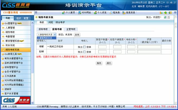 1、 可选择上方下拉列表的考核关系对当前考核关系中的成员进行逐人打分,考核人如果有分数发布的权限,还可以进行分数的“发布”和“取消发布”操作;