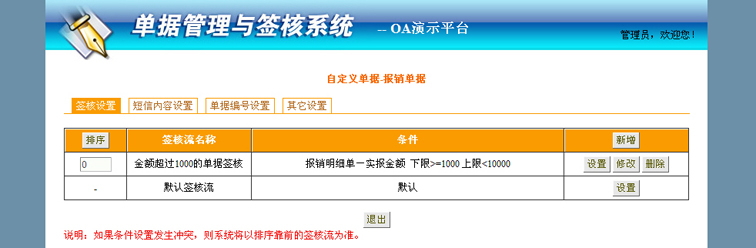 6、 如果条件设置发生冲突,系统将以排序靠前的签核为准;
