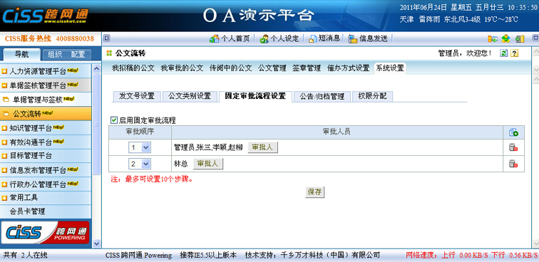 1、 对于未设定审批步骤的公文类别及不属于任何公文类别的公文,需要进行统一的审批管理时,勾选“启用固定审批流程”进行统一审议管理;