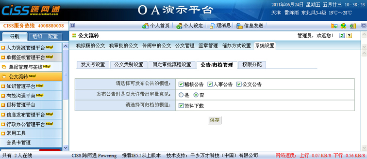 用途:设置审批通过的公开公文,能够发送到哪些公告栏模组;设置审批通过的公开公文,对应的附件能够归档到哪些资料下载模组。
