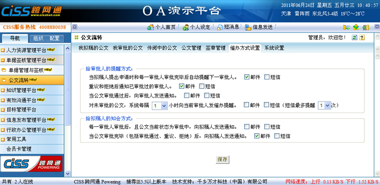 用途:公文流转系统的催办方式结合了CISS跨网通产品的跨网特点,支持短信、邮件的催办方式,便于流转过程中,公文能够及时通知到审批人和拟稿人。