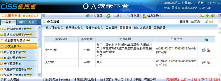 2、 模组管理员可以看到所有已经上传的签章,也能够上传签章,包括公章和私章;