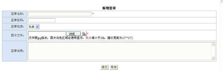 1、 点击【签章管理】标签,已有的签章以列表形式显示,包括:签章名称、签章性质、使用范围、图片文件。点击新增图标,弹出【新增签章】页面,如下图: