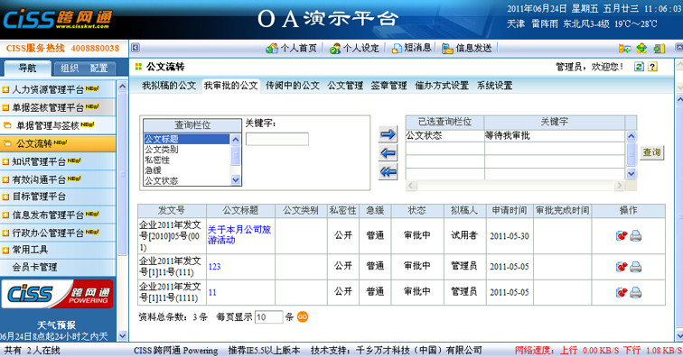 1、 公文审批页面,如果当前审批人不是个审批公文的人员,还能看到之前审批人的审批意见及审批时间;