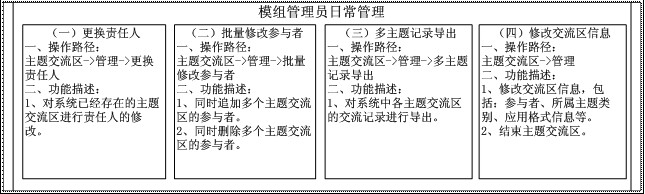 1、 模组管理员的日常管理主要包括:更换责任人、批量修改参与者、多主题记录导出、修改交流区信息(变更、删除交流区)。