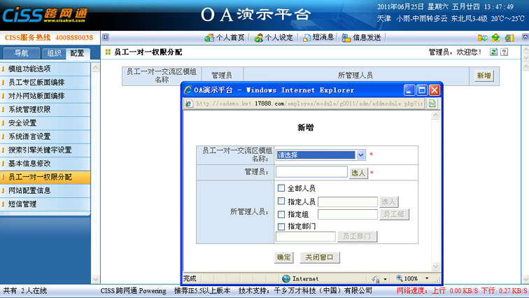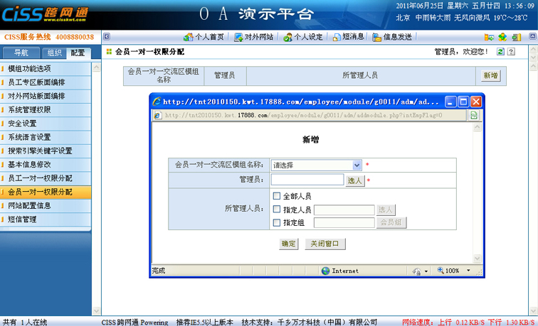 用途:模组管理员在平台使用前,首先要在系统平台【配置】下【员工/会员一对一权限分配】进行人员权限分配。
